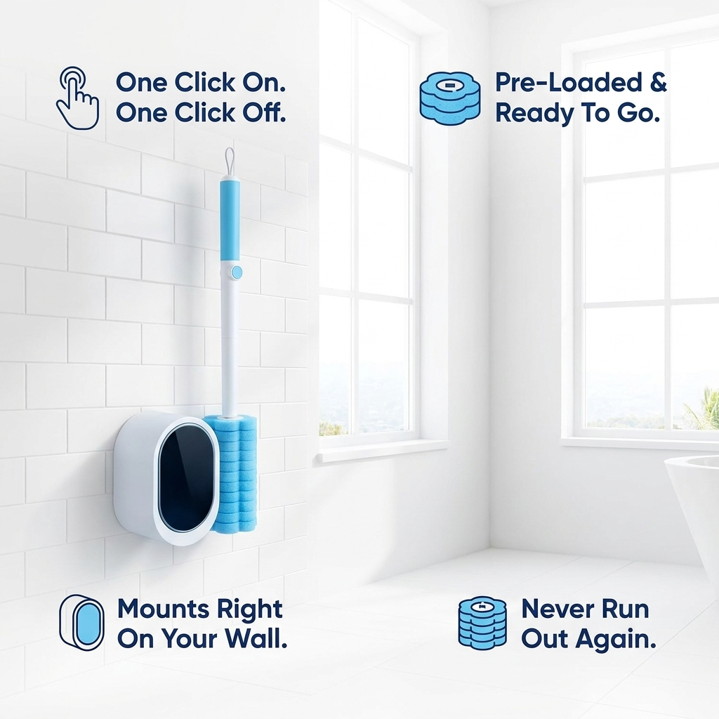 No more gross toilet brushes. Each pad clicks on and ejects straight into the trash — zero contact, zero bacteria buildup, ever.